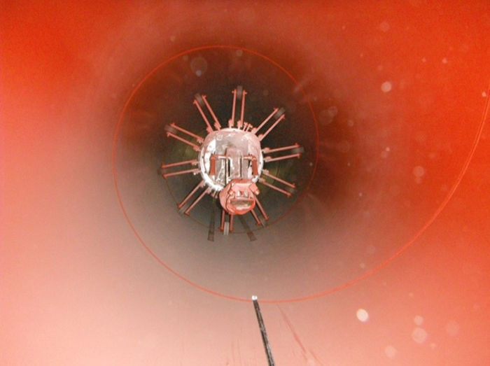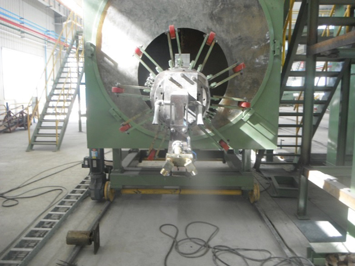 功能描述:內(nèi)壁拋丸除銹系統(tǒng)包含液壓站驅(qū)動(dòng)車(chē)、輸砂伸臂、拋頭、提升機(jī)、分離器、回丸系統(tǒng)、打砂前倉(cāng)、轉(zhuǎn)管裝置(或轉(zhuǎn)管車(chē))、打砂后倉(cāng)等。鋼管內(nèi)壁預(yù)熱后(高于室溫3°以上)轉(zhuǎn)運(yùn)到內(nèi)壁除銹工位,前后倉(cāng)將鋼管兩端密封,鋼管旋轉(zhuǎn)。液壓站、提升機(jī)、分離器、回丸系統(tǒng)、輸砂皮帶、拋頭馬達(dá)依次開(kāi)啟,打開(kāi)漏砂閥向前移動(dòng)拋頭直至鋼管末端,然后返回到初位置。