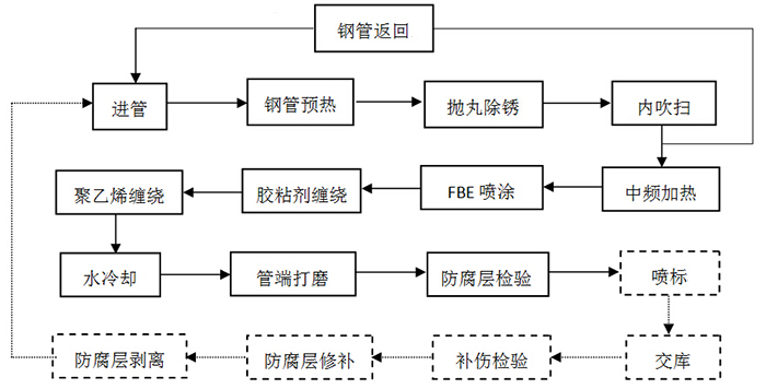 7、檢測(cè)平臺(tái)8、廢管返回直線輥道 9、廢管返回臺(tái)架 10、涂覆螺旋輥道 11、中頻加熱裝置 12、FBE噴涂裝置