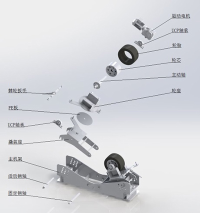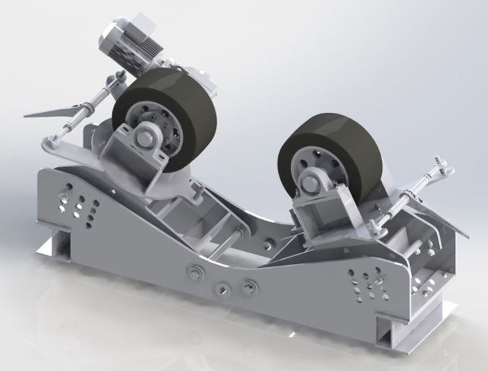雙輪胎式輸送輥道常用結(jié)構(gòu)為滑板式和孔距調(diào)整式,孔距調(diào)整式螺旋輥道具有管底高變化量小,按鋼管管徑級(jí)別調(diào)整的功能,維修維護(hù)方便,變形量小,可用于現(xiàn)場(chǎng)快速撬裝特點(diǎn)。傳動(dòng)輪角度采用棘輪調(diào)節(jié),兩輪胎包角大于60度,輪組間用拉桿相連,拉桿可調(diào)節(jié),端部采用桿端關(guān)節(jié)軸承連接,保證輪胎角度調(diào)整的簡(jiǎn)便性及統(tǒng)一性,確保傳動(dòng)線的運(yùn)行平穩(wěn);輪胎底座下兩配合面之間配1~2mm聚四氟夾層,調(diào)整輪間距時(shí)簡(jiǎn)捷省力;調(diào)節(jié)精度在調(diào)節(jié)輪組處均配裝刻度尺,以便于觀察。傳動(dòng)線在調(diào)整完畢后,用鎖緊裝置將傳動(dòng)線鎖緊。并保證調(diào)節(jié)裝置能夠取下移出。